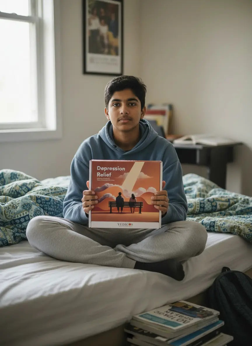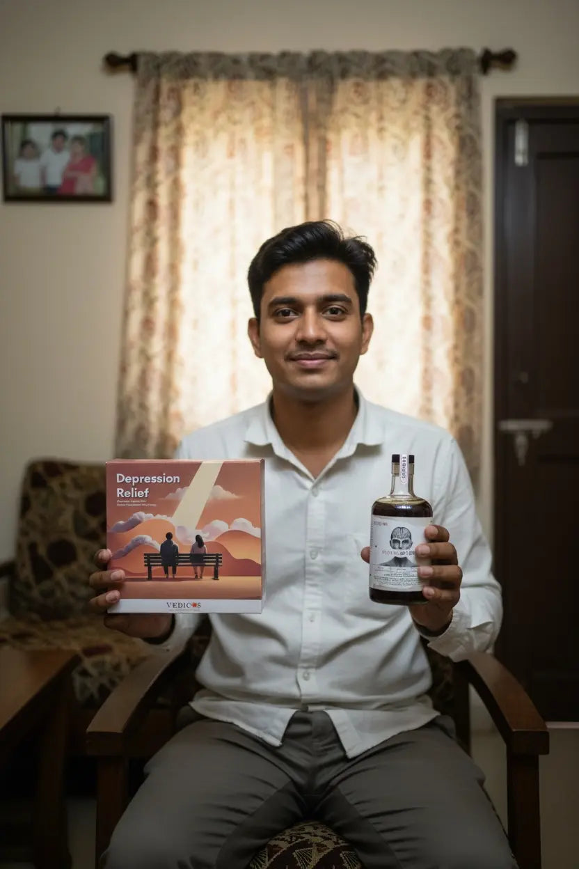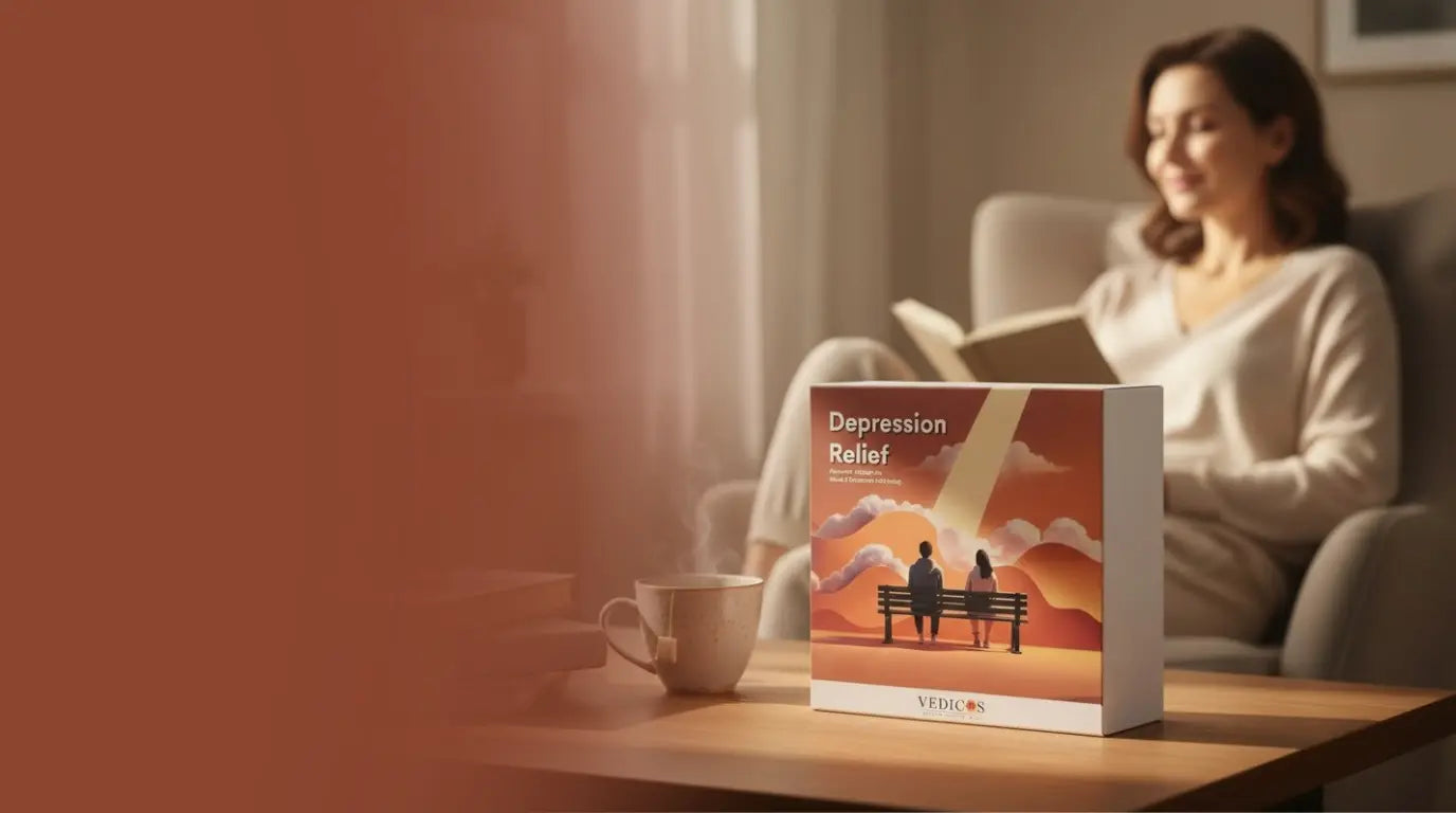 The Vedicos Depression Relief Pack is a 2-in-1 program that combines Ayurvedic medicine and CBT-based therapy to support emotional balance, mood improvement, and long-term mental well-being.