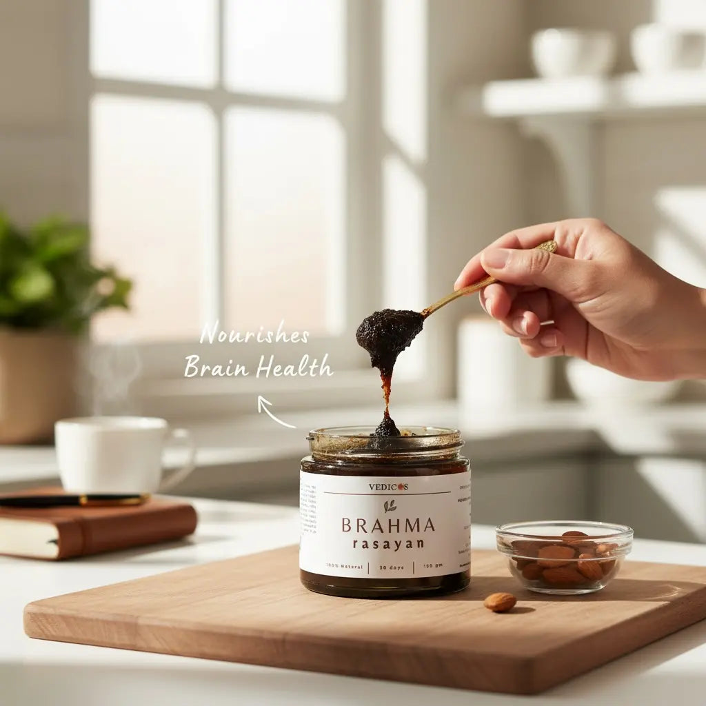 Vacha is a natural nootropic that enhances concentration and clears mental fog. It reduces overthinking, sharpens focus, and promotes clarity of mind.